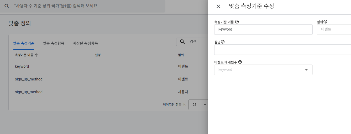 GA에서 [관리] - [속성 설정] - [데이터 표시] - [맞춤 정의] 에서 [맞춤 측정기준 만들기] 버튼을 클릭하여 keyword라는 맞춤 측정기준을 추가합니다.