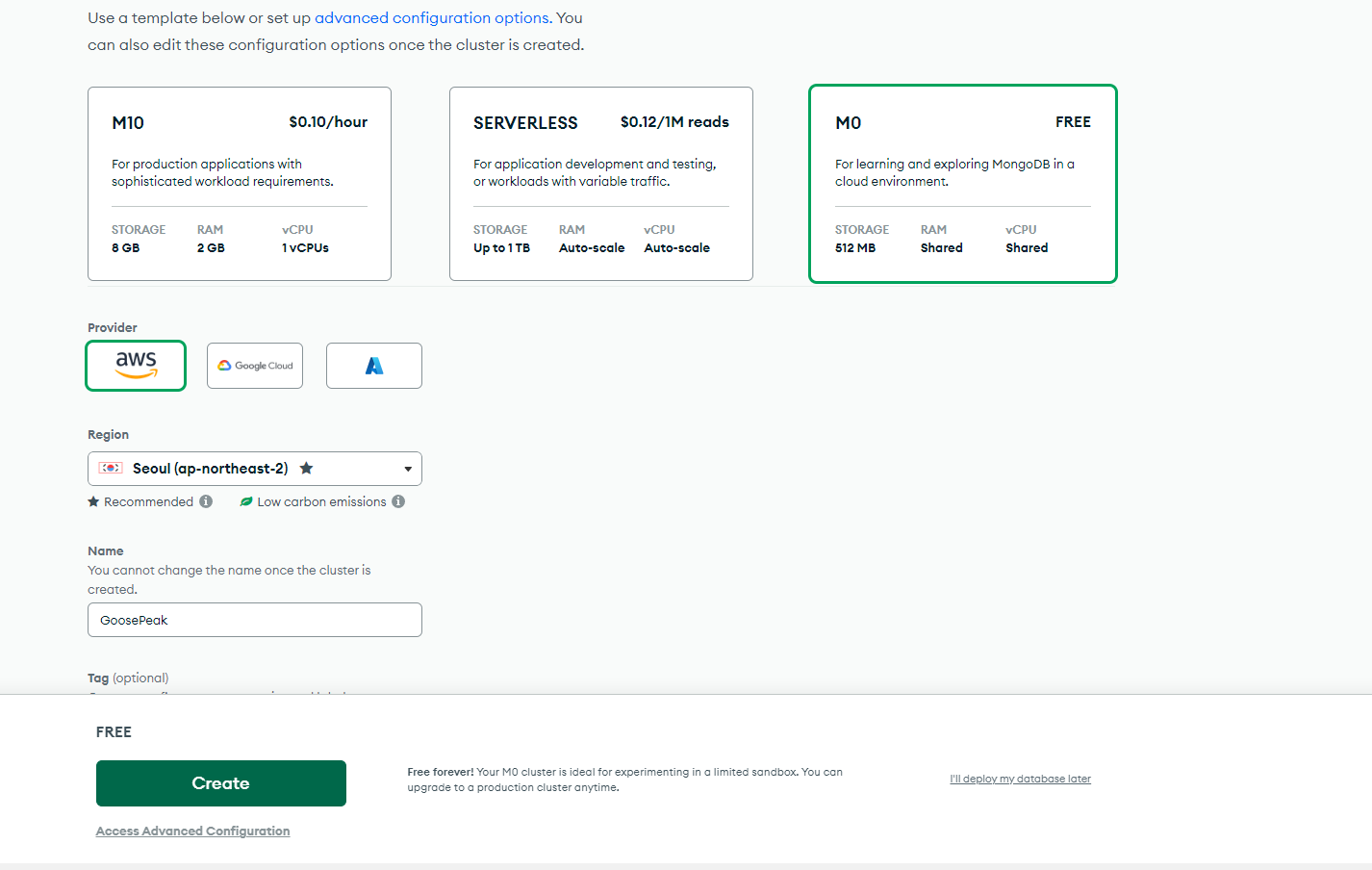 - 일단 Free로 제공되면서 Seoul을 제공하는 Cloud 중에 선택하자. Azure는 없다. 거리에 따른 속도차이가 분명 있다. Cluster 명을 정해주고 Create 버튼을 클릭한다.