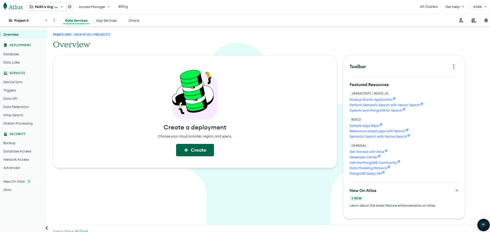 - Atlas OverView 확인, Create 클릭
